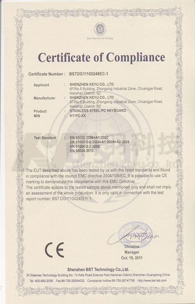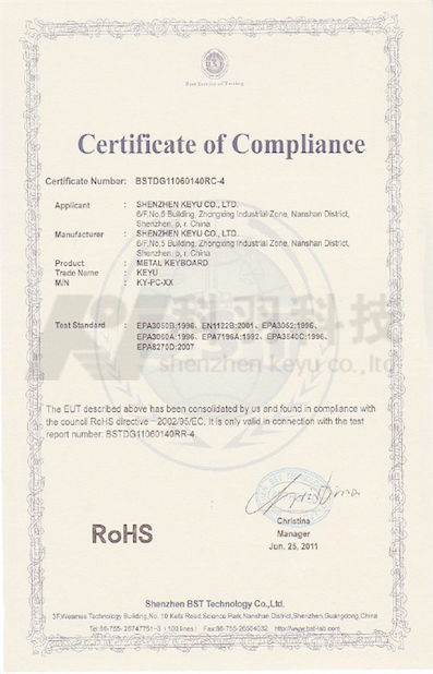 Standard:ROSH Certificate of Compliance Zahl:BSTDG11060140RC-4 Heft Datum:2011-06-25 Ausgestellt von:Shenzhen BST Technology Co.,Ltd |