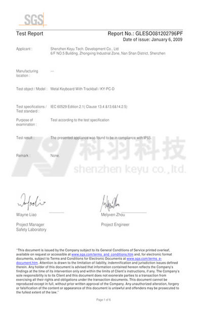 Standard:IP65 Waterproof Zahl:GLESO081202796PF Heft Datum:2009-01-06 Ausgestellt von:SGS |