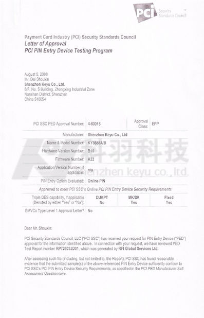Standard:PCI PIN entry Device certification (PCI 1.3) Zahl:4-60015 Heft Datum:2008-08-05 Scope / Range:EPP Ausgestellt von:PCI Security Standards Council |